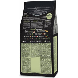 Poulet frais* (min. 15% avant la cuisson), dinde fraîche* (min. 15% avant la cuisson), poulet déshydraté (12%), racines de manioc* (9%), petits pois entiers* (9%), graisse de poulet (préservée avec des antioxydants naturels), riz complet* (7%), porc déshydraté (5%), pomme de terre déshydratée* (4%), gousse de caroube* (3%), orge complet* (2%), saumon déshydraté (2%), levure de bière* (2%), protéines de poulet hydrolysées (2%), légumes et fruits frais avant la cuisson (pomme* 1%, carotte* 0,5%, brocolis* 0,5%), pulpe de betterave, graines de lin* (1%), huile de saumon (préservée avec des antioxydants naturels), œuf déshydraté* (0,5%), sel gemme*, luzerne déshydratée*, racines de chicorée (FOS)*, extrait de levures (MOS), algues marines déshydratées* (500 mg/kg), glucosamine (500 mg/kg), yucca schidigera, chondroïtine sulfate (100 mg/kg), airelles* (100 mg/kg), thé vert* (100 mg/kg), échinacée* (100 mg/kg), fleur de camomille* (100 mg/kg). *INGRÉDIENTS NATURELS