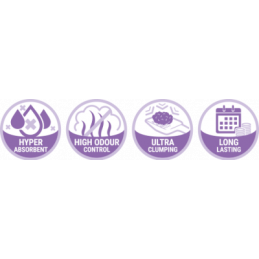 Litière agglomérante pour chat à haute capacité d'absorption des liquides. Les molécules d'essence dans les grains parfumés qui y sont ajoutés agissent lorsqu'elles entrent en contact avec le liquide, permettant à un agréable parfum de lavande de se répandre dans l'environnement.